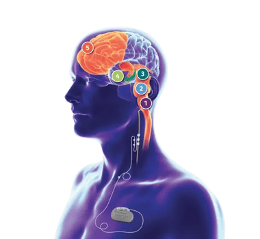 Vagale Afferenzen projizieren in erster Linie zum Nucleus tractus solitarius (NTS), der dann Fasern zu anderen Hirnstammkernen sendet, die die subkortikale und kortikale Aktivität modulieren. Dieses vagale afferente Netzwerk ist wahrscheinlich die neurale Basis für die anfallshemenden Wirkungen der VNS Therapy.